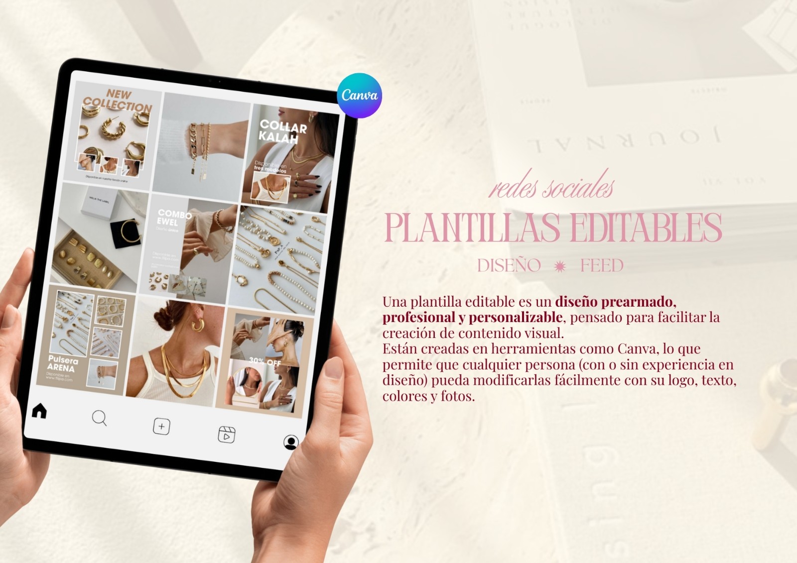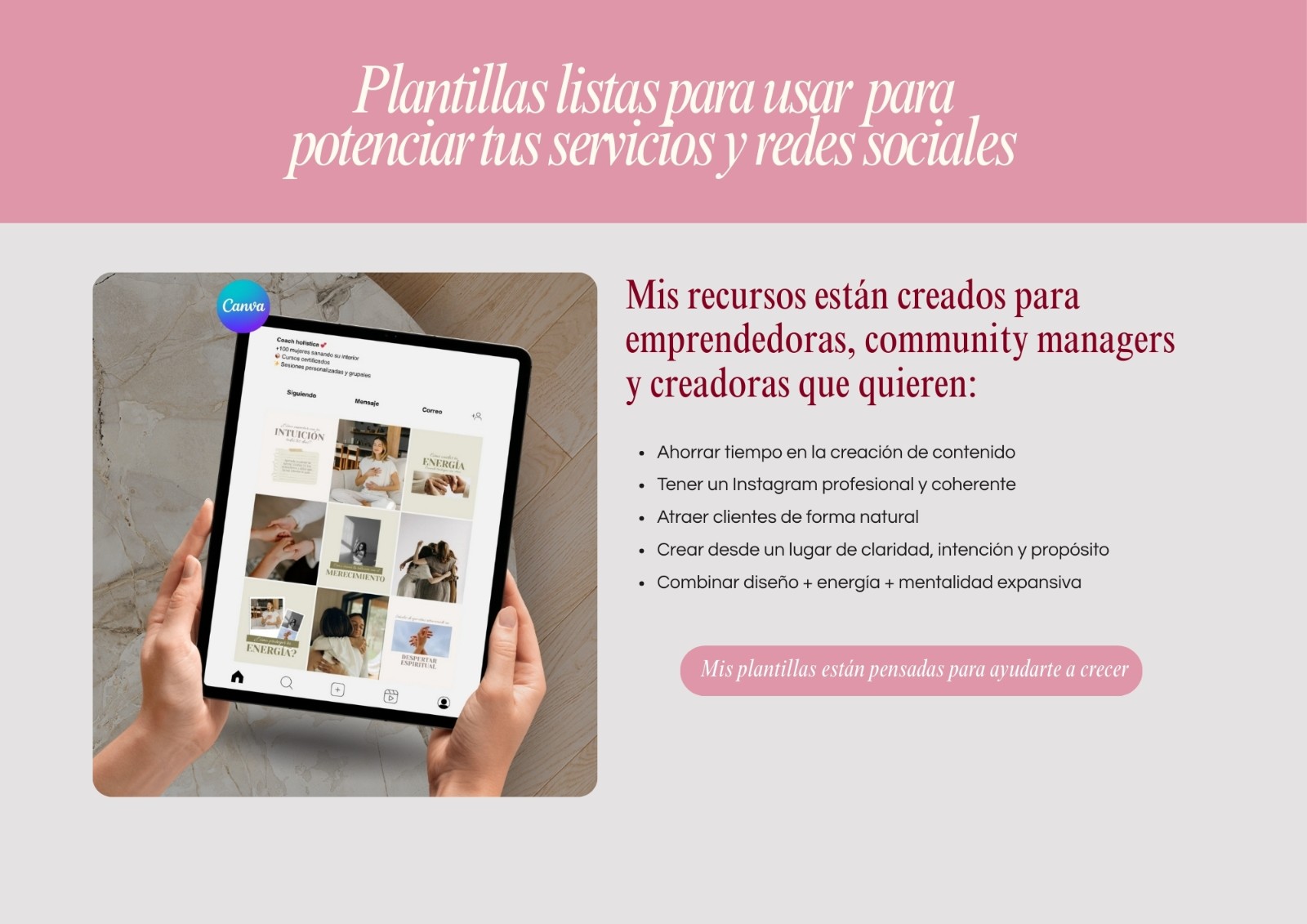 Es una herramienta de trabajo con 120 plantillas editables y 6 estilos diferentes, para mujeres con marca personal que quieren dejar de perder tiempo, ordenar su comunicación y enfocarse en hacer crecer su negocio.